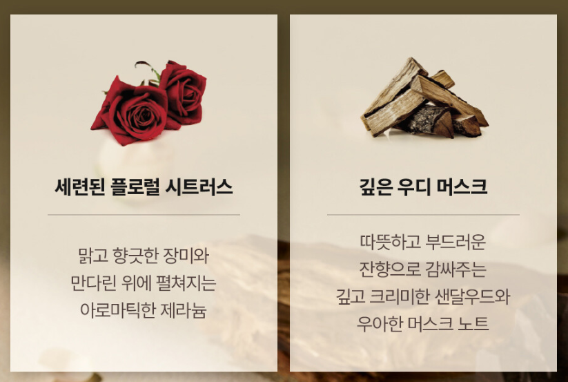 - 세련된 플로럴 시트러스: 장미와 제라늄이 어우러진 상큼한 플로럴 향