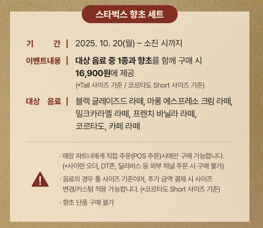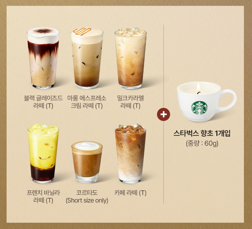 - Tall 사이즈 음료 1잔 + 수향 캔들 1개 구성
