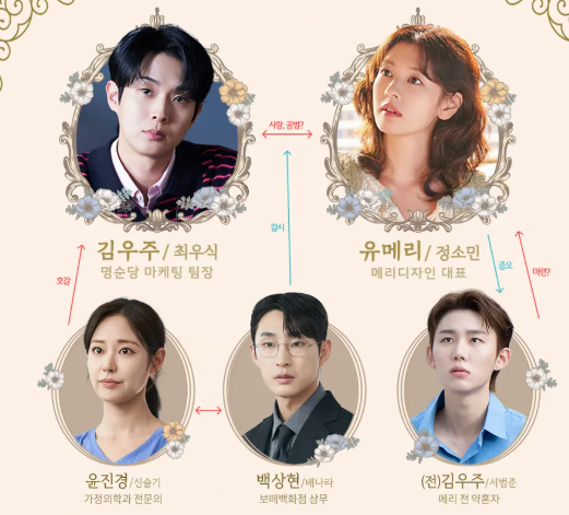 A. 우주와 메리는 계약결혼 → 진짜 감정, 상현과 진경은 각각 삼각관계와 짝사랑을 형성합니다.