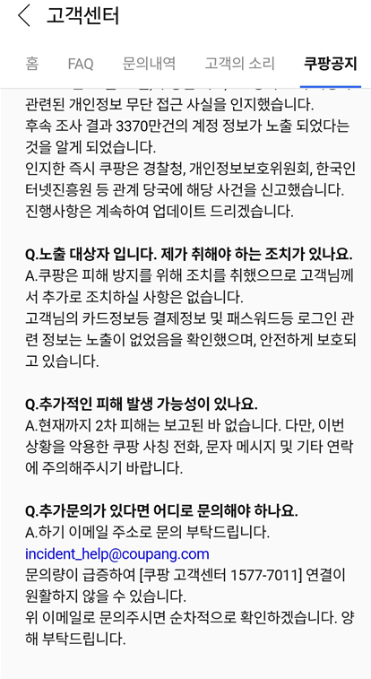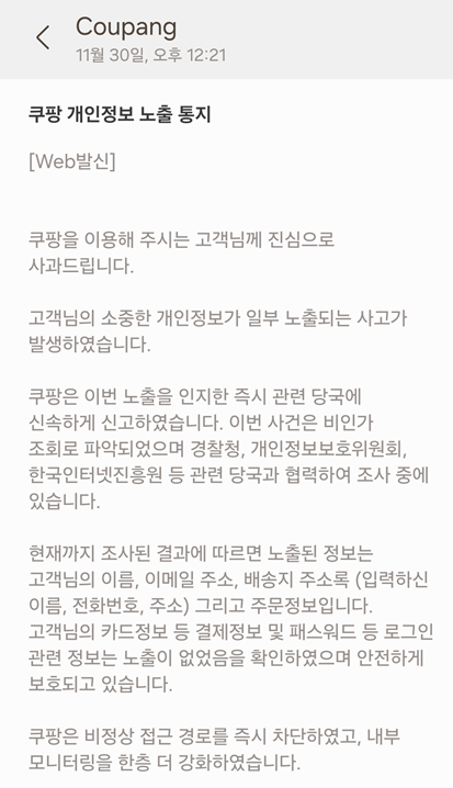 쿠팡은 해킹 사실을 인지한 지 5개월이 지나서야 공개했고, 일부 피해자에게만 문자로 통보했습니다.