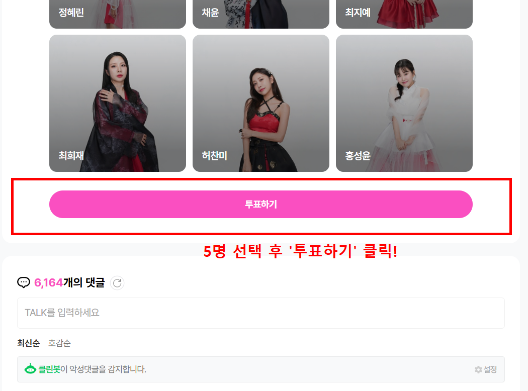 하루 한 번, 5명의 참가자를 선택해야 투표가 완료됩니다.