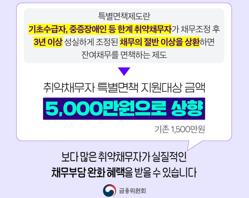 금융위원회는 2026년 1월 30일부터 상환 능력이 현저히 낮은 취약채무자들을 위해 '취약채무자 특별면책' 대상 금액을 기존 1,500만 원에서 원금 합계 5,000만 원 이하로 대폭 상향했습니다. 이는 채무 규모가 커서 기존 제도의 사각지대에 놓여있던 분들에게 실질적인 재기 기회를 제공하기 위함입니다.